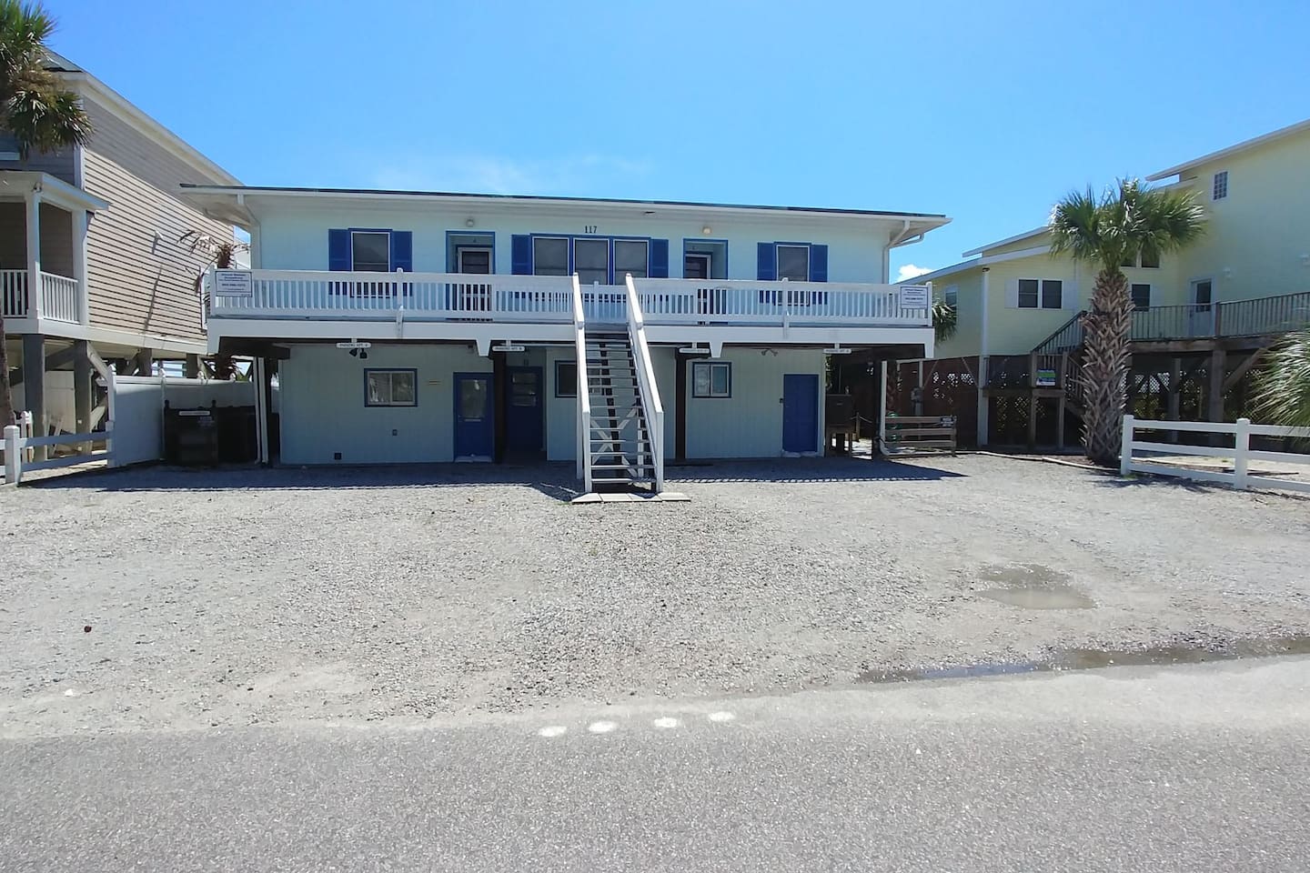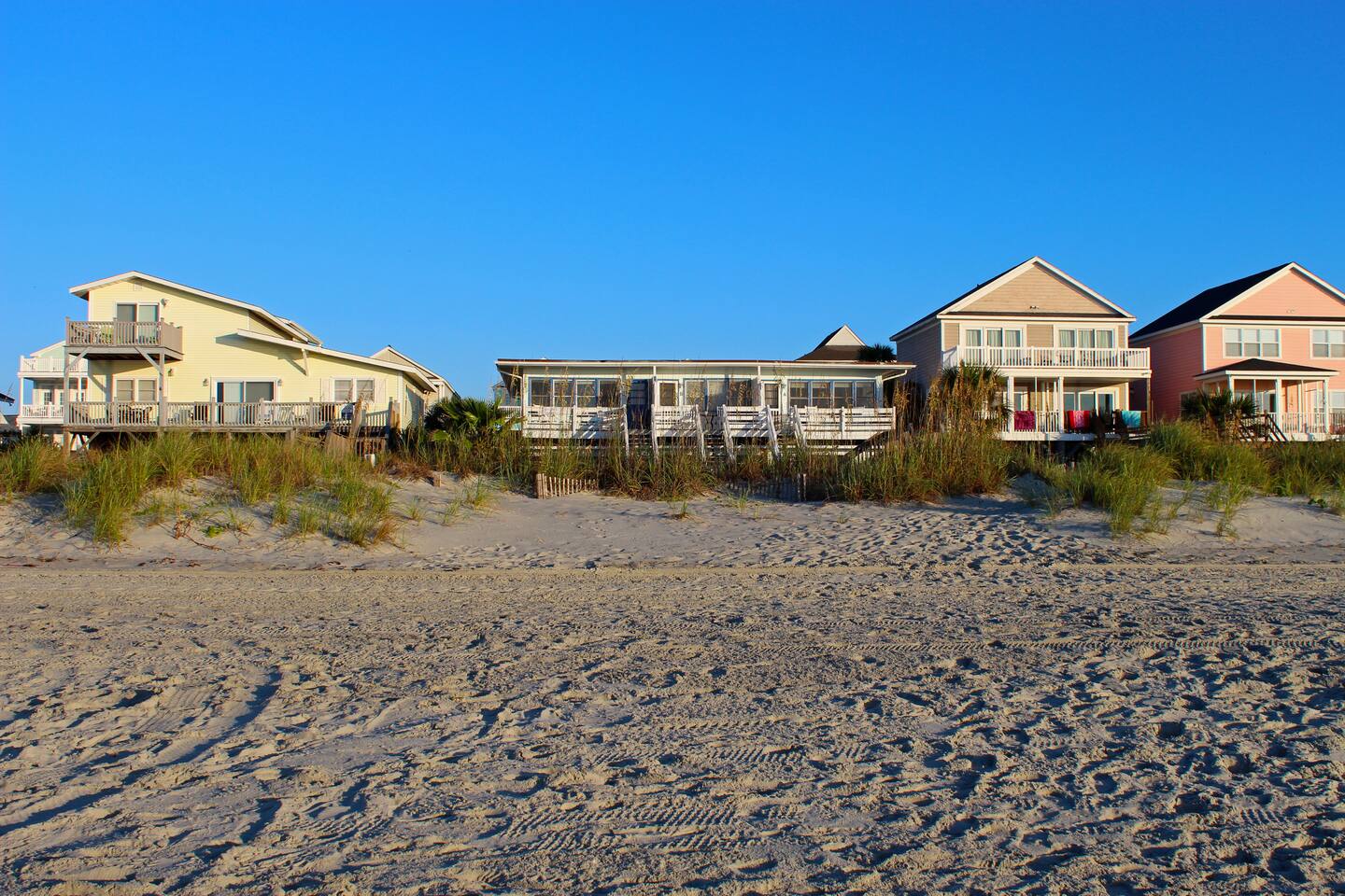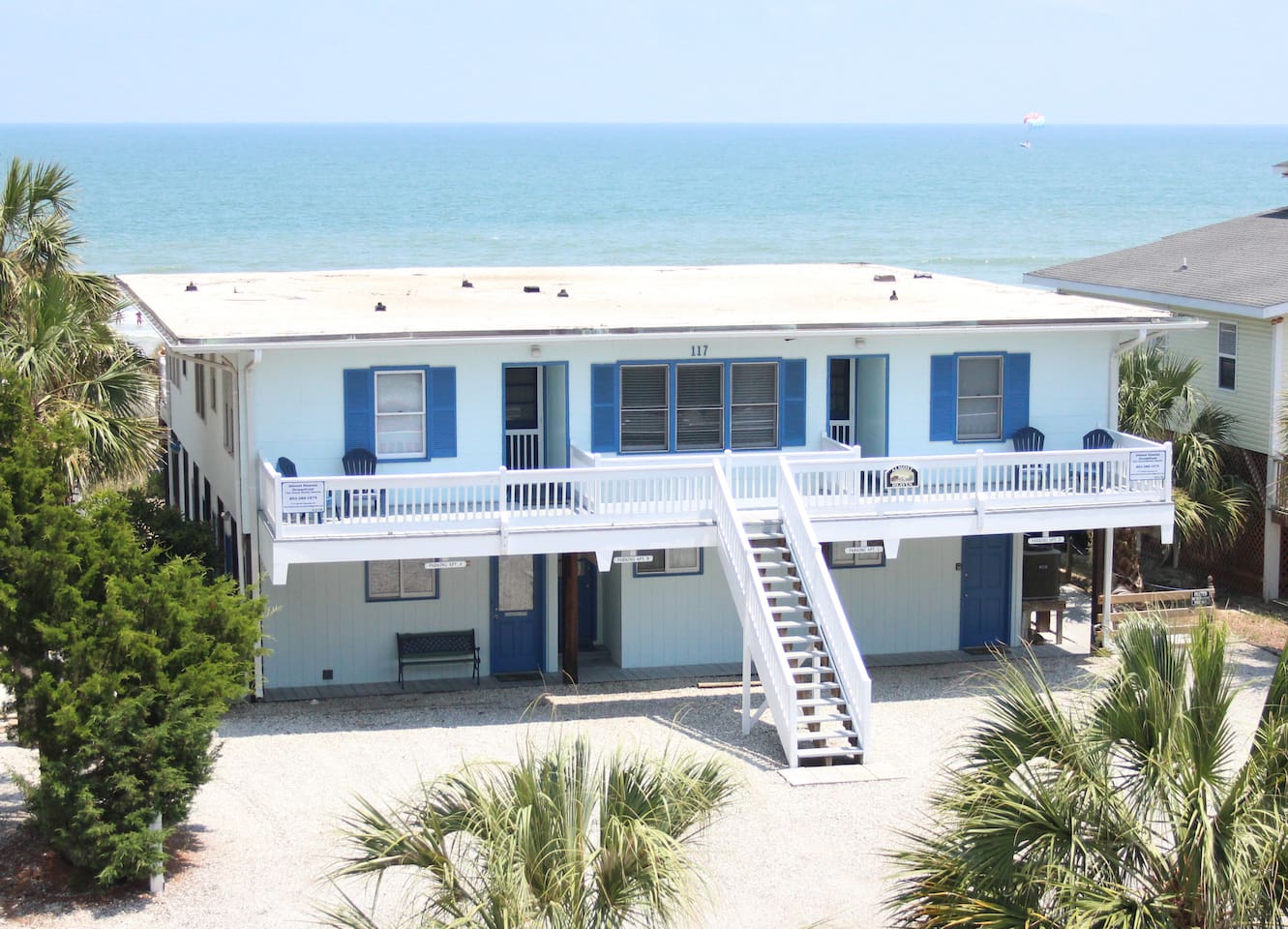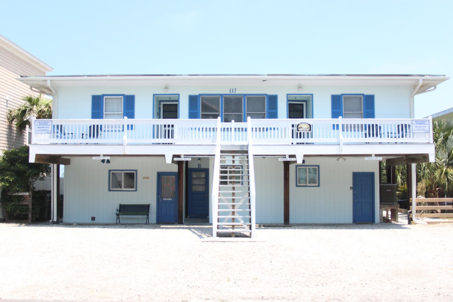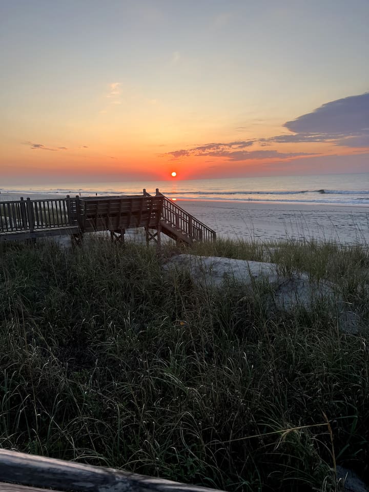 Stay on the Beach, Not Near It! All units are **oceanfront**, offering breathtaking views and direct beach access. Our complex features four units, including 2-bedroom/2-bath and 3-bedroom/3-bath options, accommodating 10-13 guests. Accommodations: - 3BR/3BA unit with a full kitchen - Bedrooms: 1 Queen, 2 Queens, 2 Doubles, plus a Queen Sleeper and Rollaway - Convenient 1st-floor location with no stairs - Spacious living areas (LR/DR/KIT combo) - Fully equipped with cooking and dining utensils - Central air/heat and ceiling fans - Shared washer/dryer - Private parking for two vehicles - Outdoor deck with shared charcoal grills and outdoor shower - Entertainment: 2-3 flat-screen TVs (40 inch), WIFI, DVD/VCR combo - Shared deck box with beach toys, games, chairs, umbrellas, and boogie boards Additional Units: We offer two 2-bedroom/1-bath units for 6-8 guests and a 2-bedroom/2-bath units for 10 guests. Perfect for family gatherings—rent all four units for a private, yet communal vacation experience! Pet-Friendly: We welcome friendly, housebroken dogs with a $100 pet fee per dog (subject to weight and breed approval). Amenities: - Linens provided (included in the cleaning fee) - Access to beach, laundry, outdoor shower and parking Book your stay at our beachfront paradise and enjoy the convenience and luxury of staying directly on Surfside Beach!